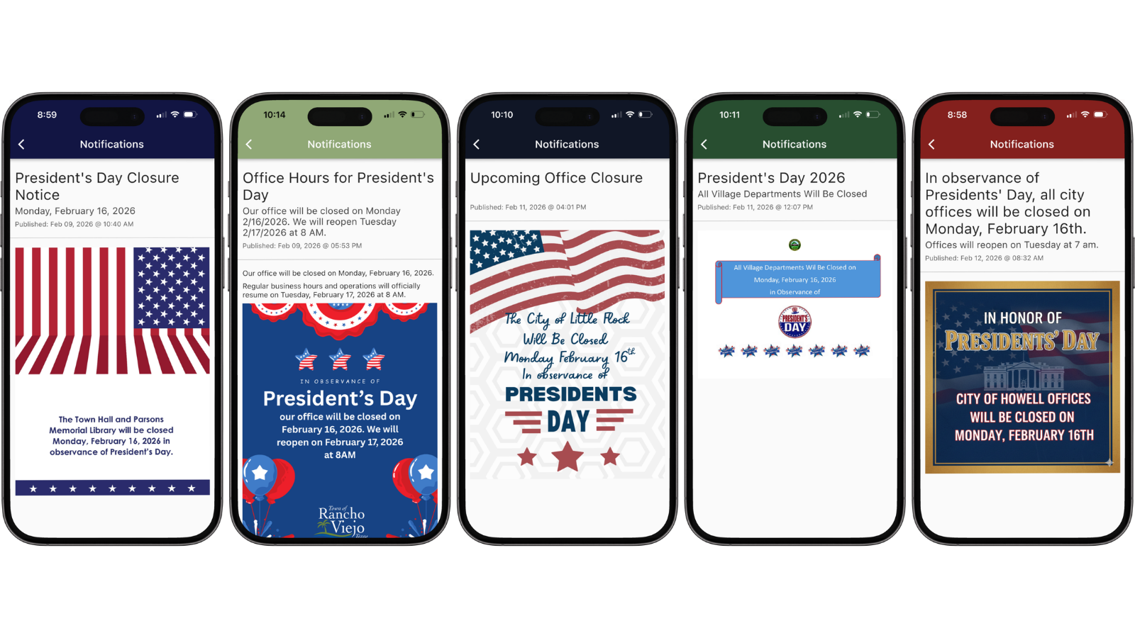 Here are ready-to-use notification examples for Presidents' Day, organized by the topics residents care about most.