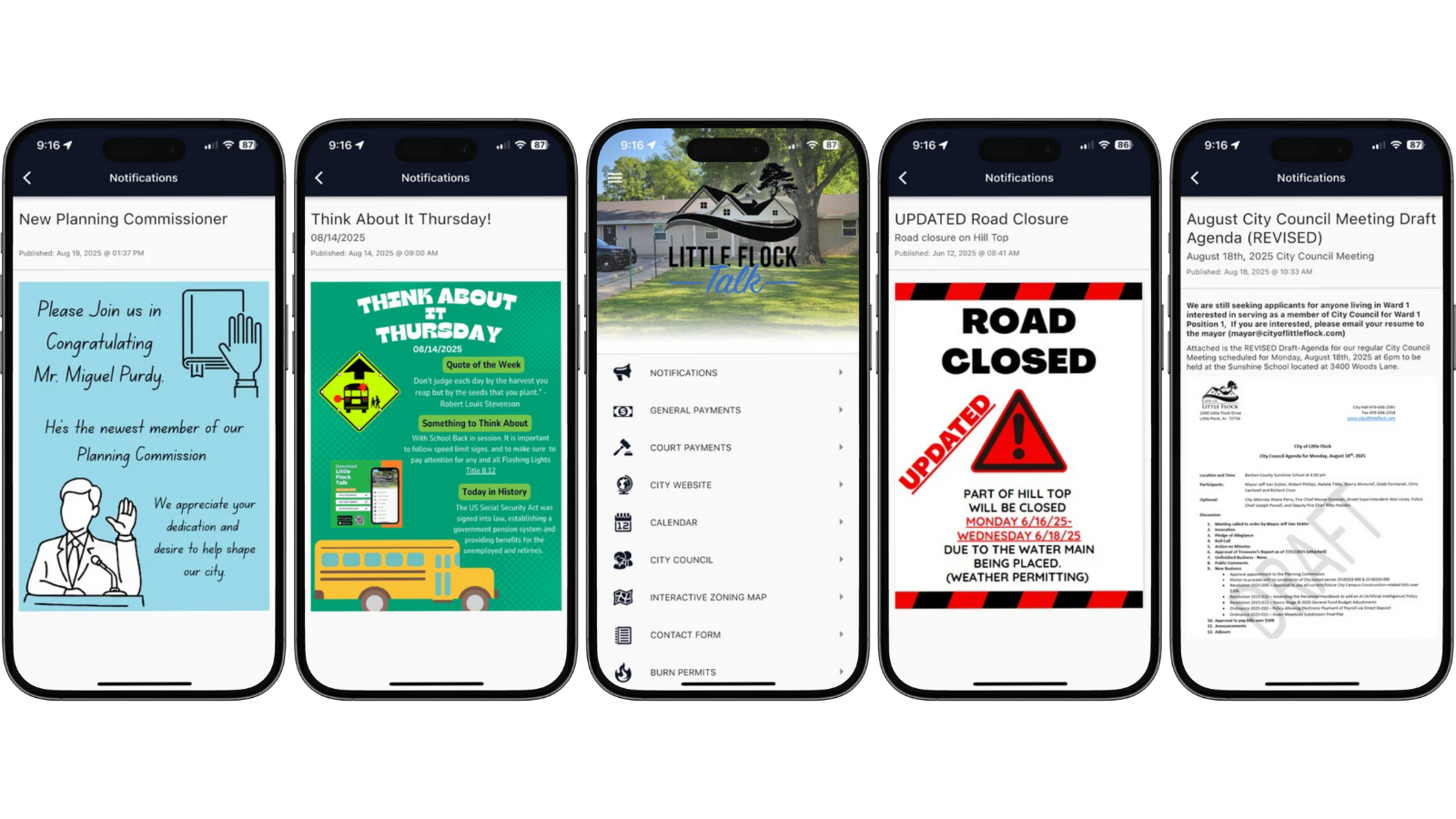 Today, Little Flock keeps residents informed in real time through its branded mobile app, Little Flock Talk, using GOGov's Citizen Notifications. Mayor Van Sickler and key staff post critical updates, meeting notices, and day-to-day administrative information that keeps the community connected.