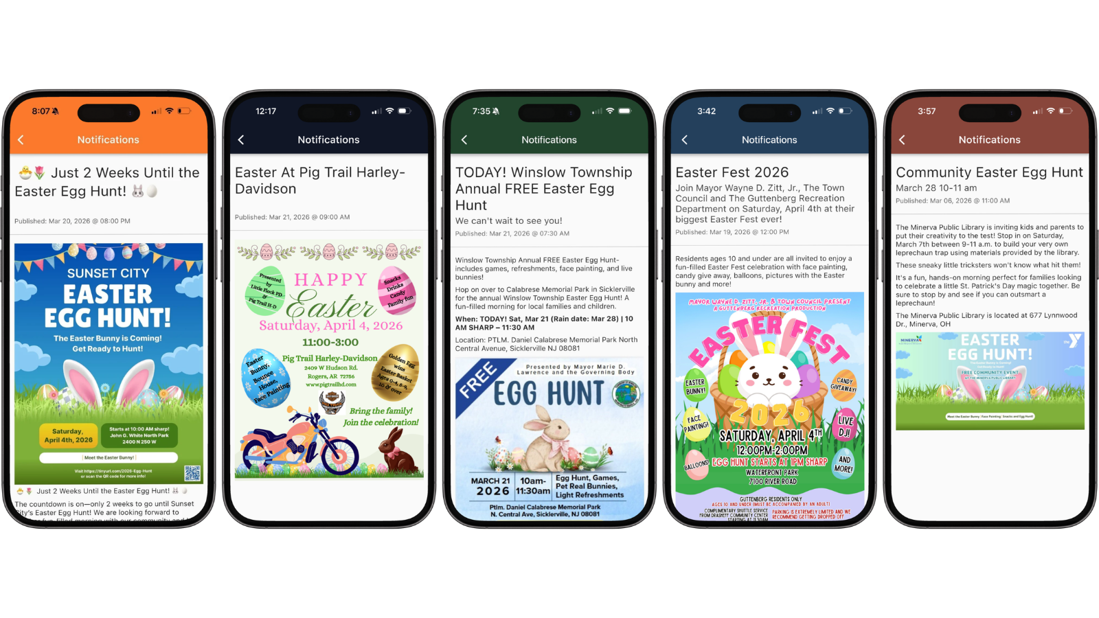 This is when communities were promoting dates, times, locations, and last-minute reminders. Village of Vinton kept it festive: "🐰 4th Annual Easter Eggstravaganza 🐣🌷". Borough of Watchung — the highest-volume Easter communicator in the GOGov network with 8 notifications — used the final two weeks to build momentum with a steady drumbeat of reminders. Town of Wawayanda, Village of Garden City, and Village of Whitehouse each sent a consistent 3-notification sequence to make sure their events stayed top of mind.