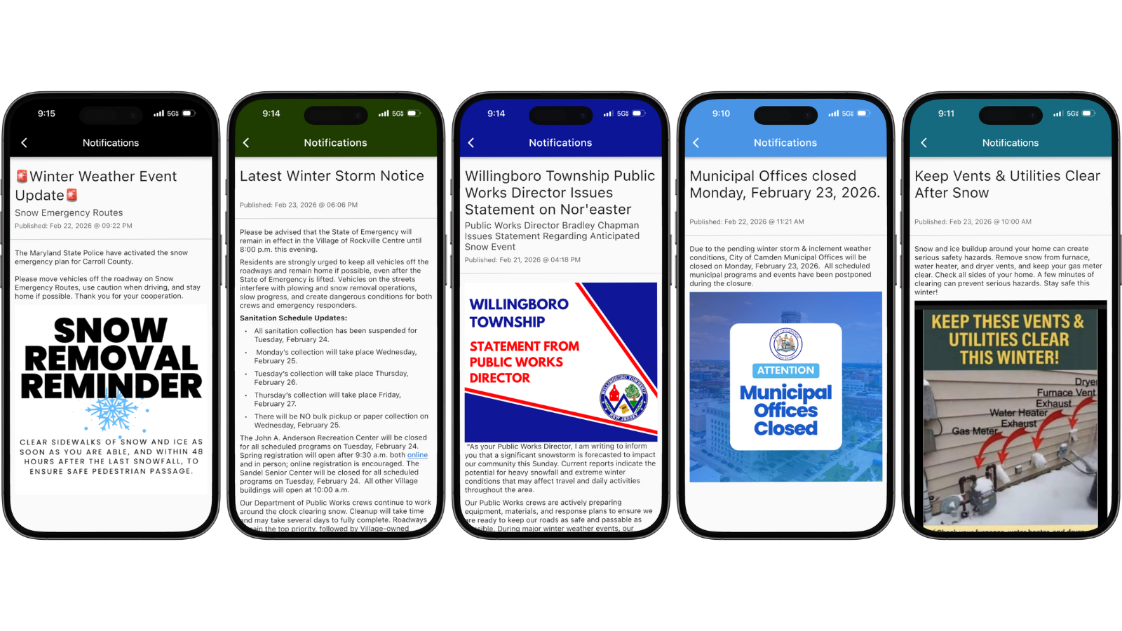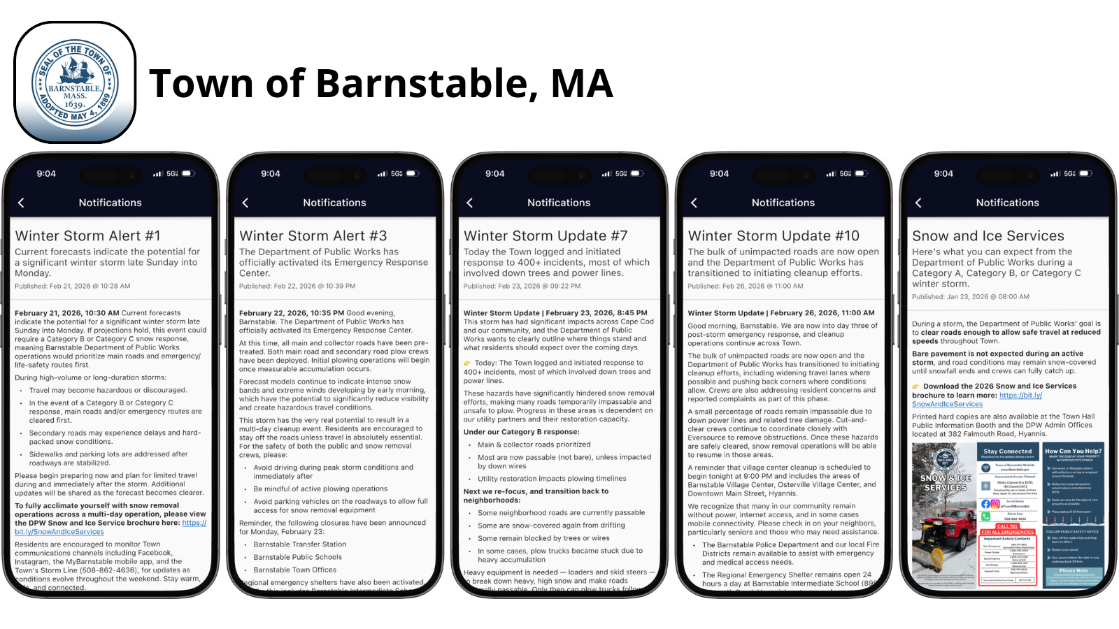 Before the worst of the storm arrived, agencies were already reaching out. Township of Warren, NJ pushed a "Winter Storm Warning — Prepare Today" notification on February 21 and followed it hours later with a "Severe Winter Weather" alert via email, mobile push, and SMS. Town of Barnstable, MA issued "Winter Storm Alert #1" — the first in what would become a numbered series of seven updates sent over the next 72 hours — so residents always knew an update was coming.