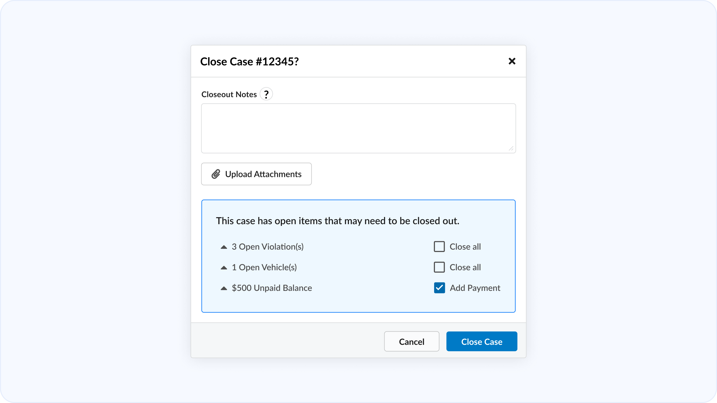 Add closeout notes, and quickly close out all open violations, vehicles, and unpaid balances on a case when status is changed to closed.