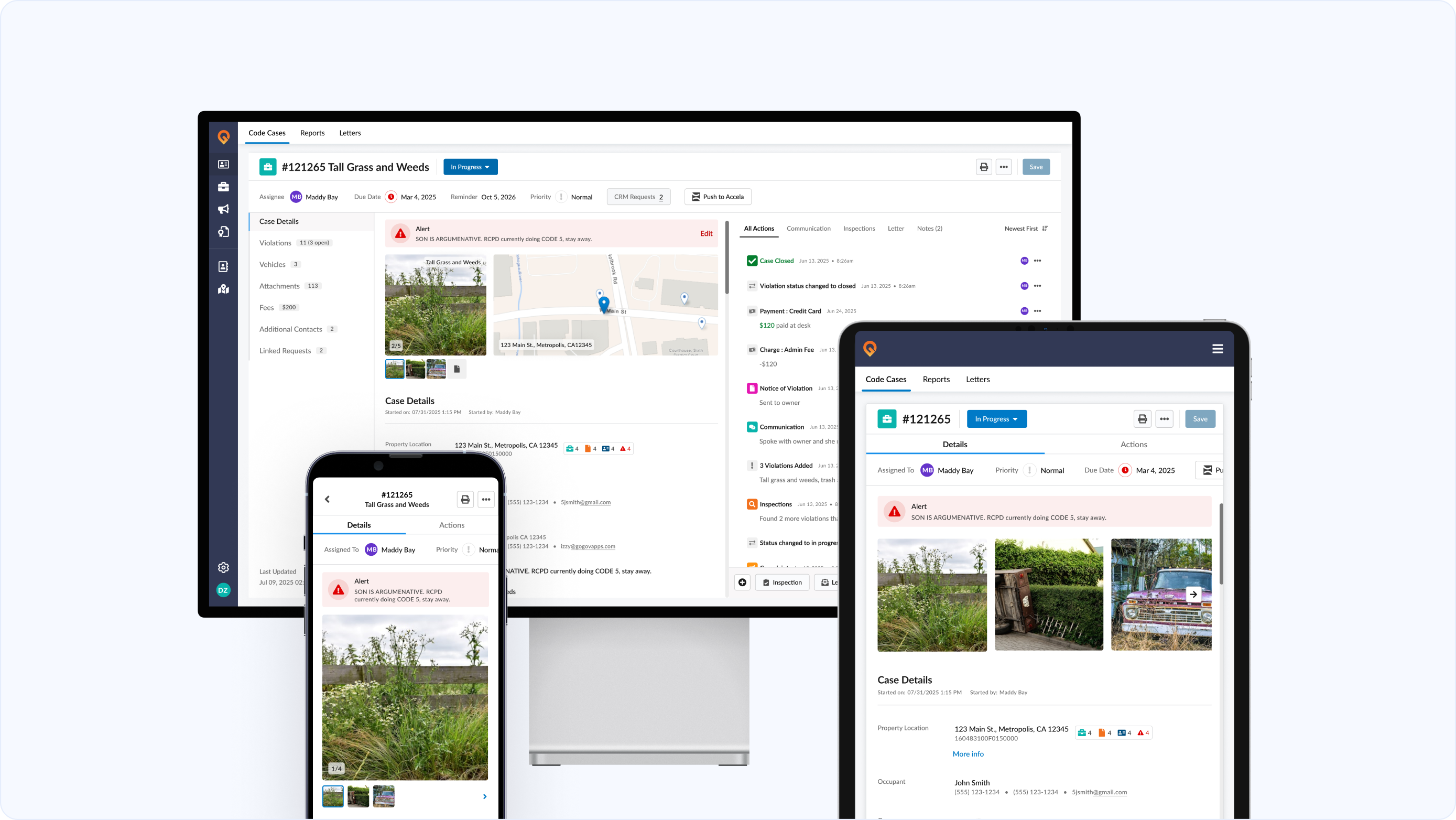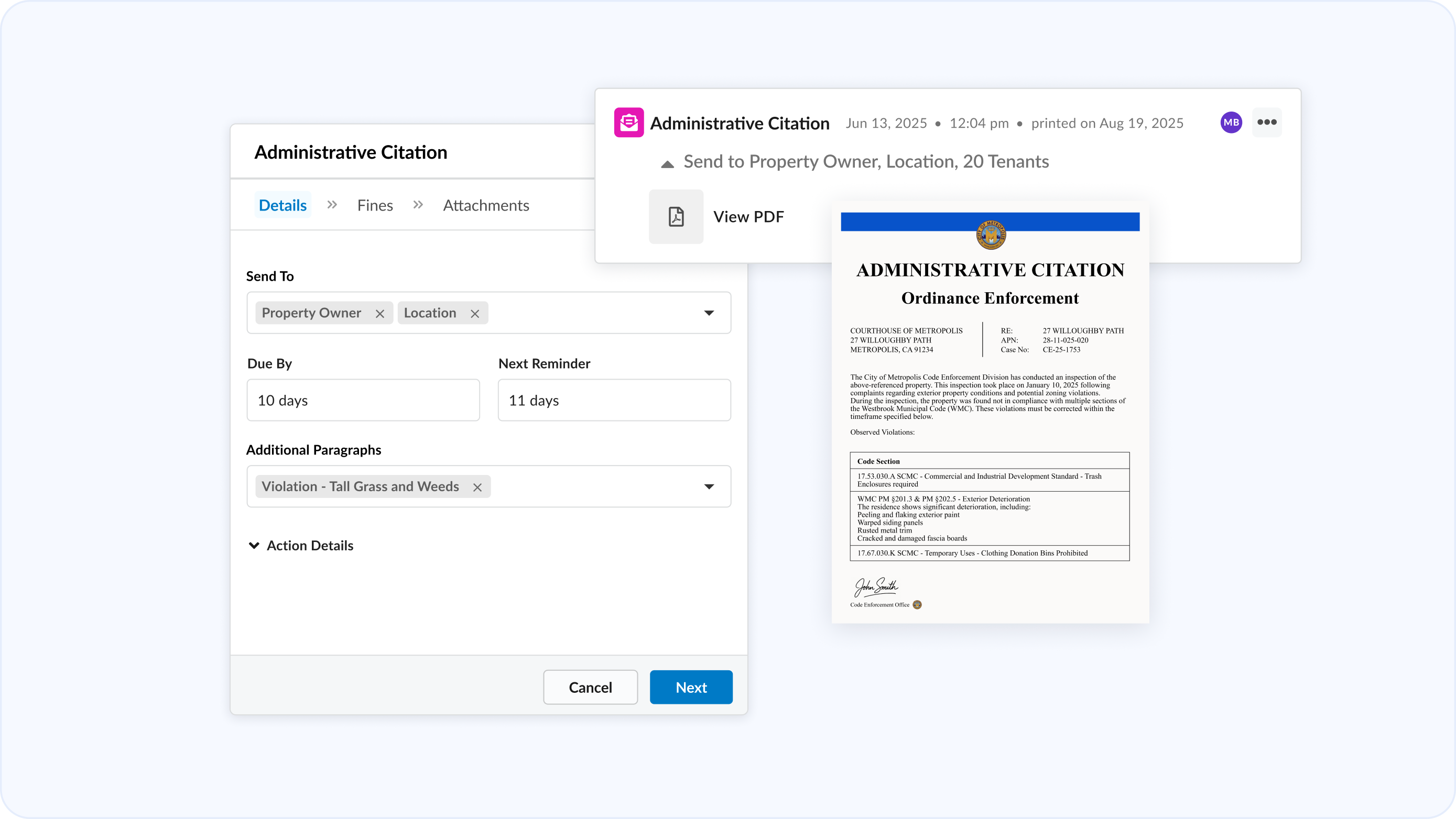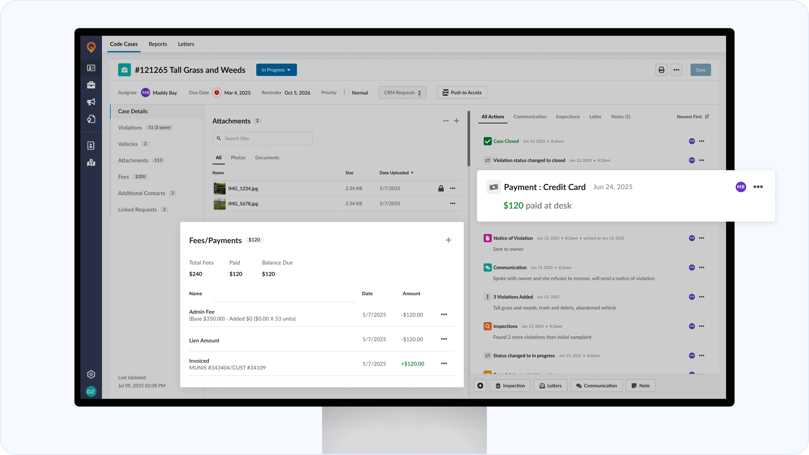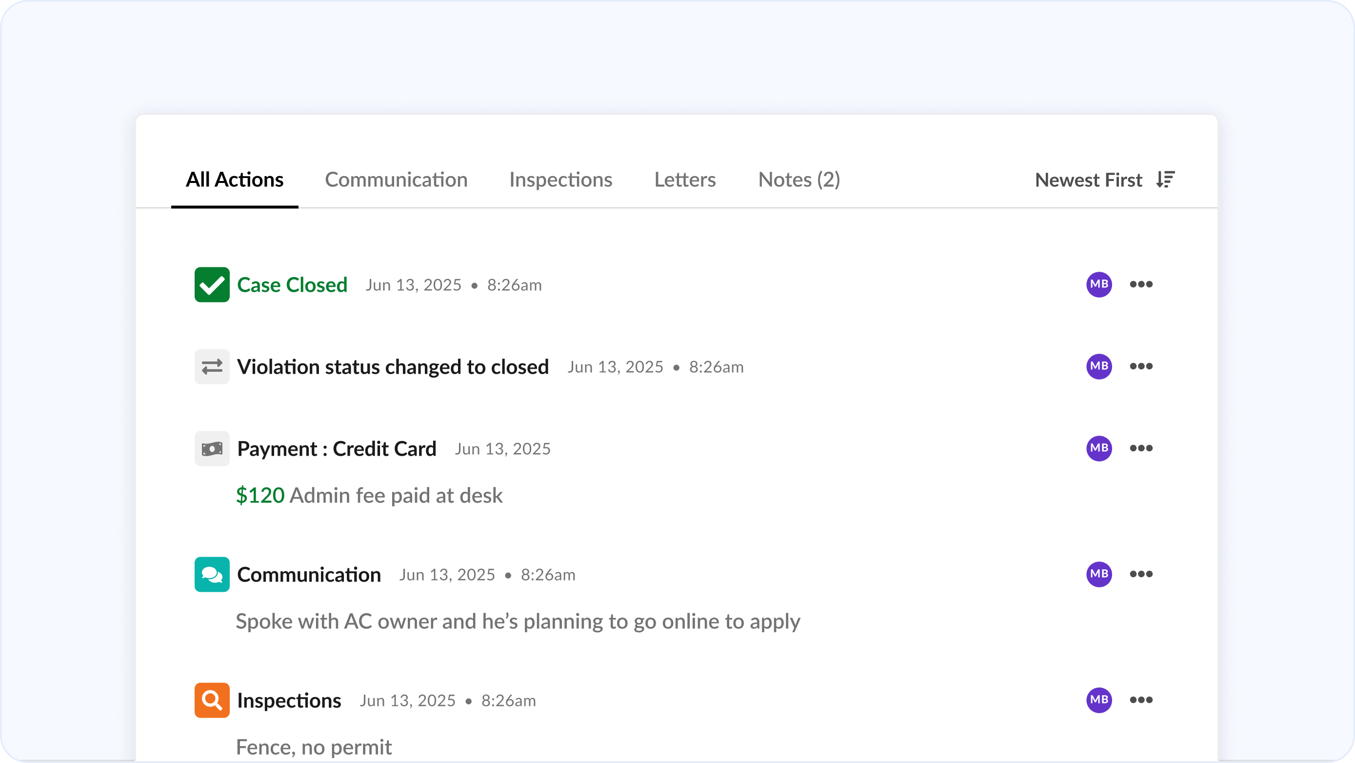 A unified action timeline that surfaces every action and associated attachment, person, and timestamp in one view. Track critical events such as fee charges, payments, and violation updates right alongside daily actions for complete context.