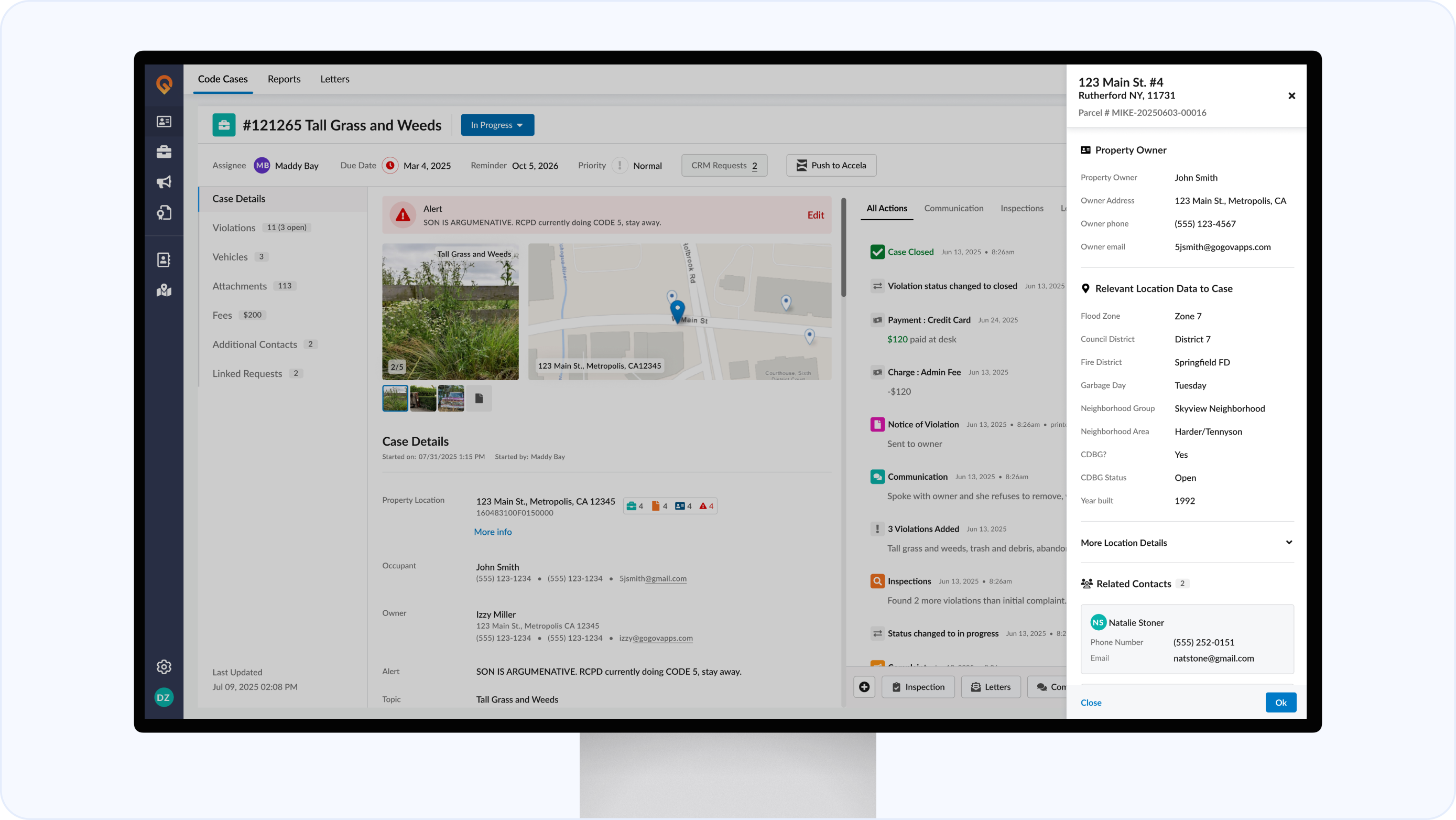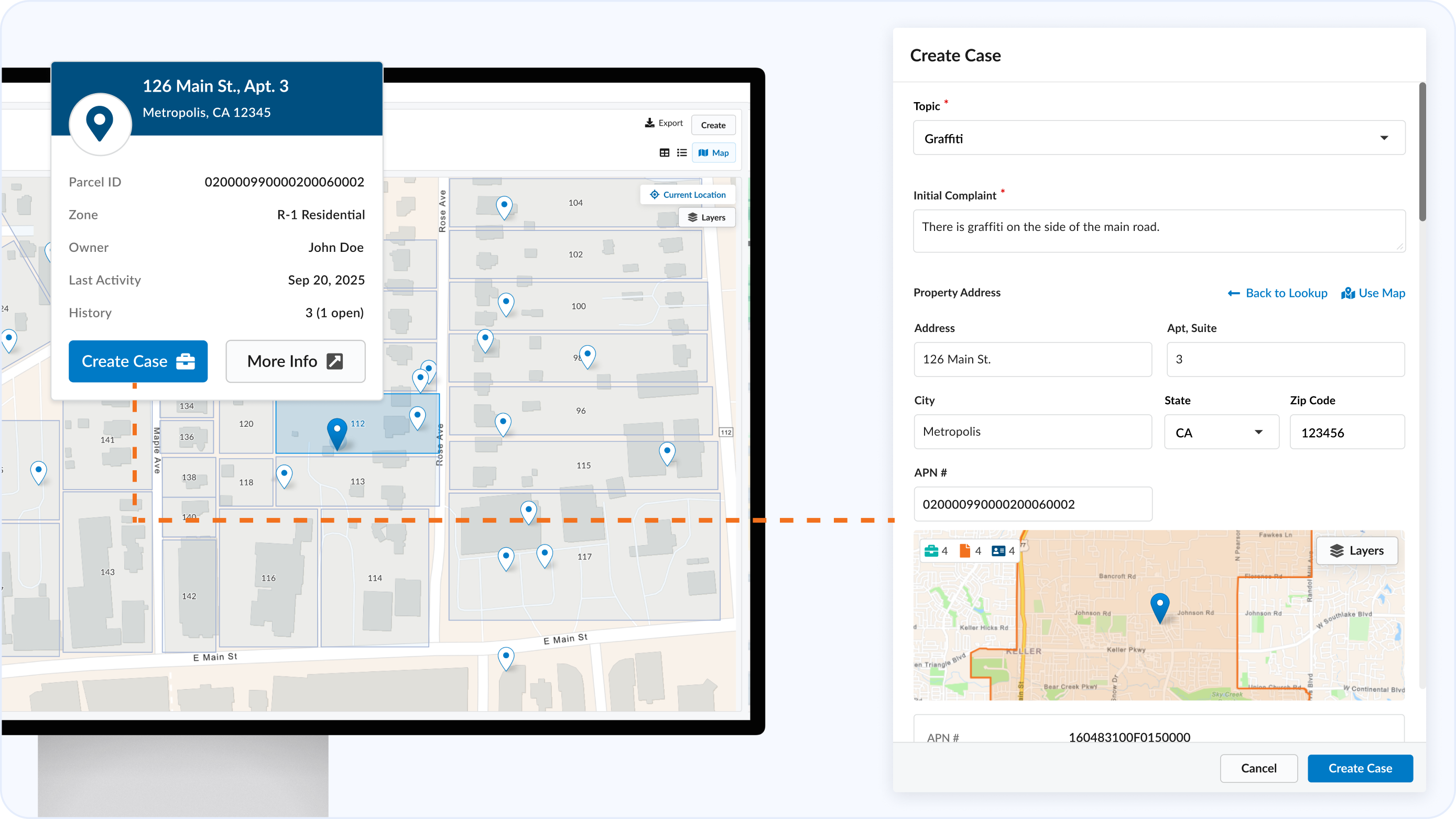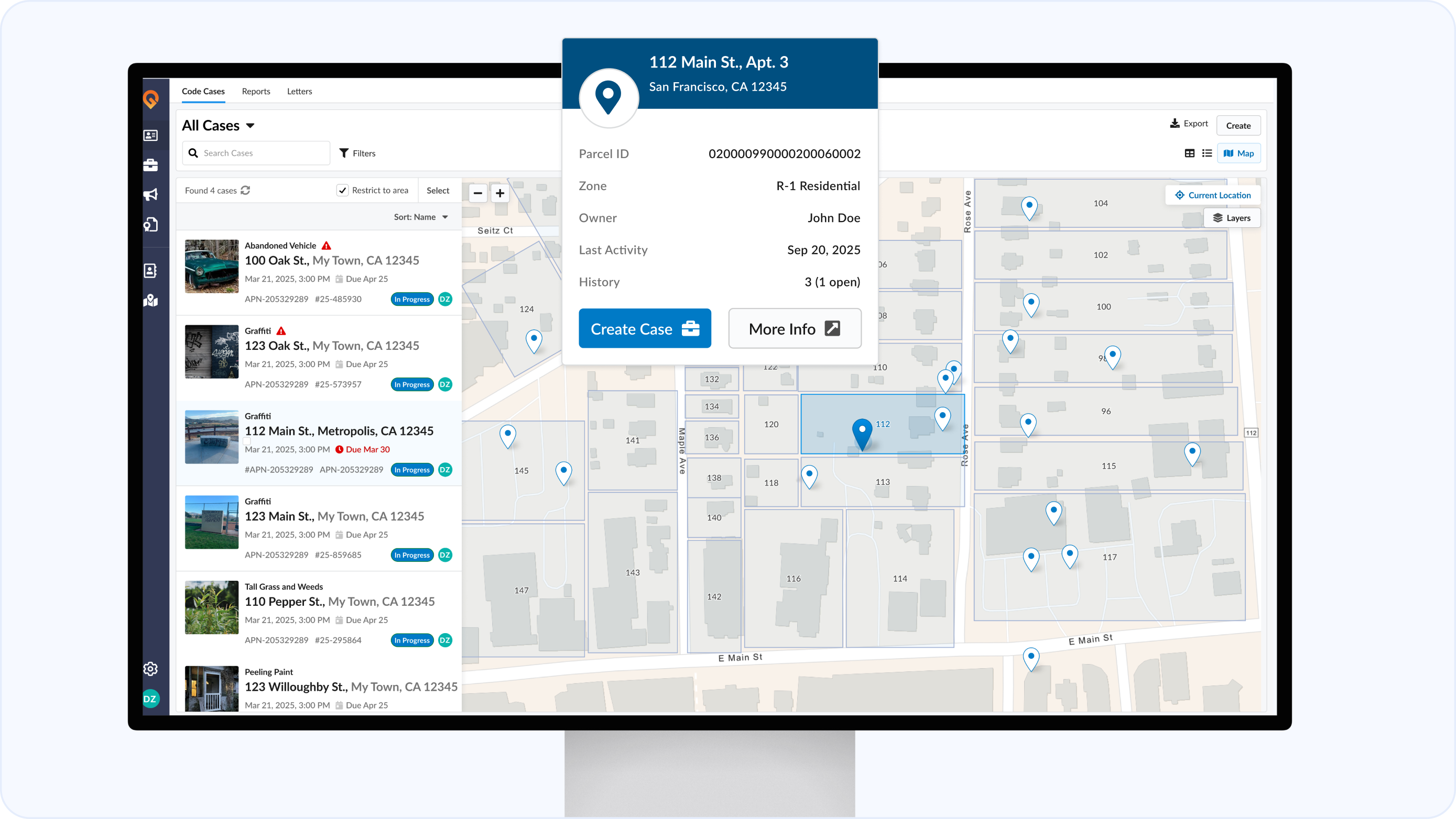 Instantly preview owner info, open cases, and related records by hovering over a parcel on the map.