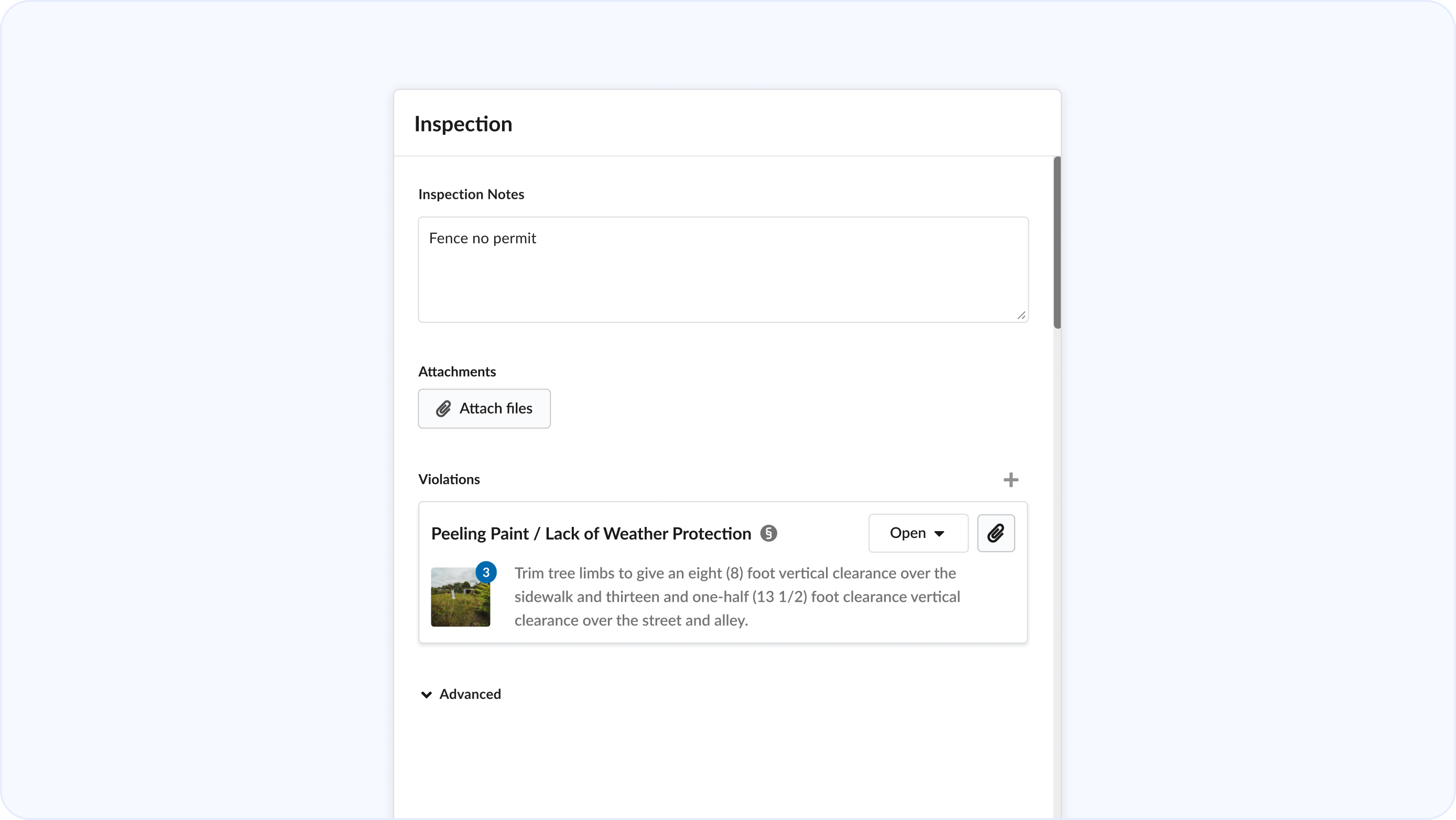 Add violations and their images as you perform inspections. Mark violations resolved during follow-up inspections with one click.