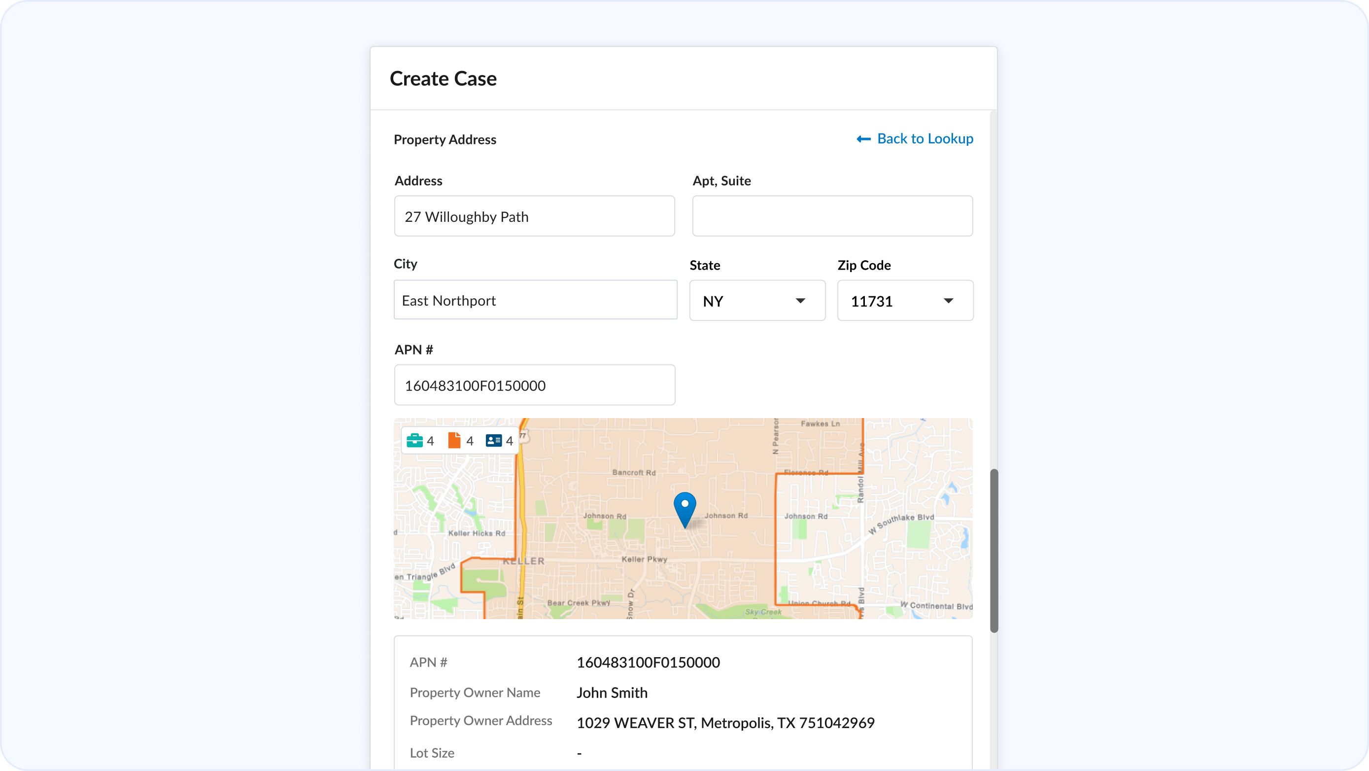 Faster create flow with location lookup, auto-parcel matching, and duplicate detection — only expand advanced options if needed.